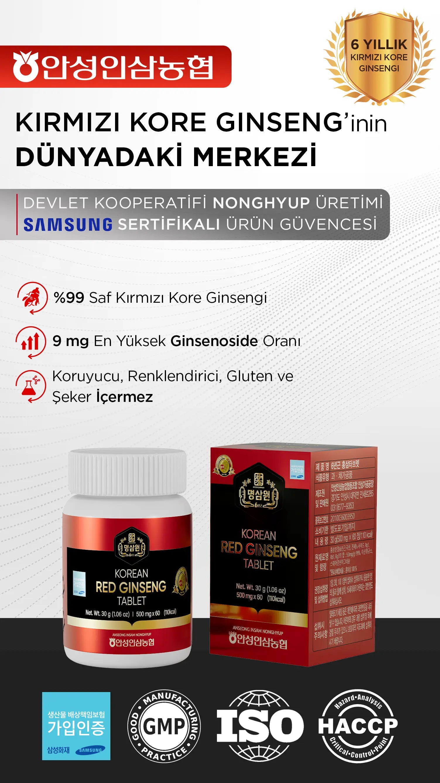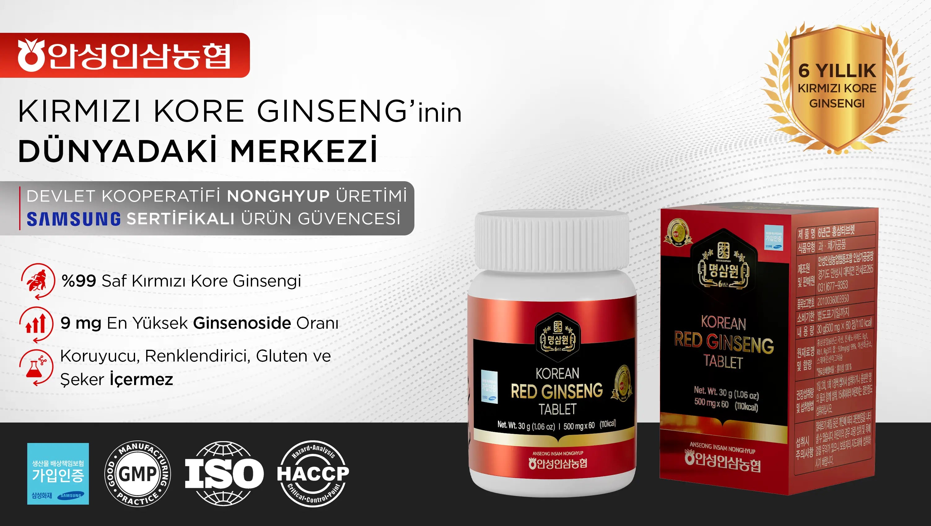 Her bir tablet, %99 saf 6 yıllık Kore Kırmızı Ginseng tozu içerir. Özel formülüyle 9.0 mg/g Ginsenoside (Rg1, Rb1, Rg3) oranıyla doğal enerji, bağışıklık ve odak desteğini en yüksek seviyede sunar.